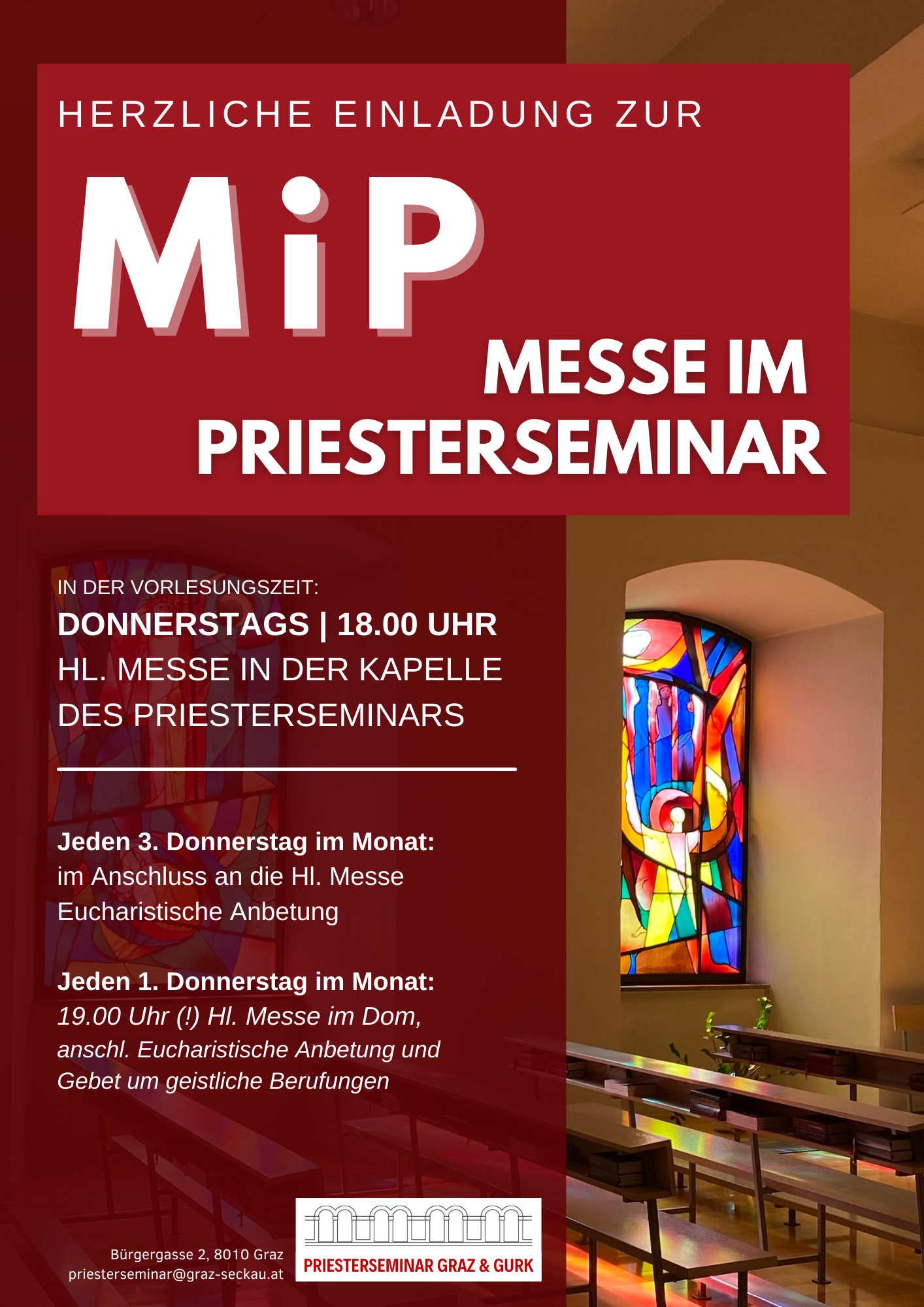 Jeden Donnerstag in der Vorlesungszeit findet donnerstags um 18.00 Uhr die Hl. Messe in der Kapelle des Priesterseminars statt. Herzliche Einladung an alle Studierenden zur Mitfeier!