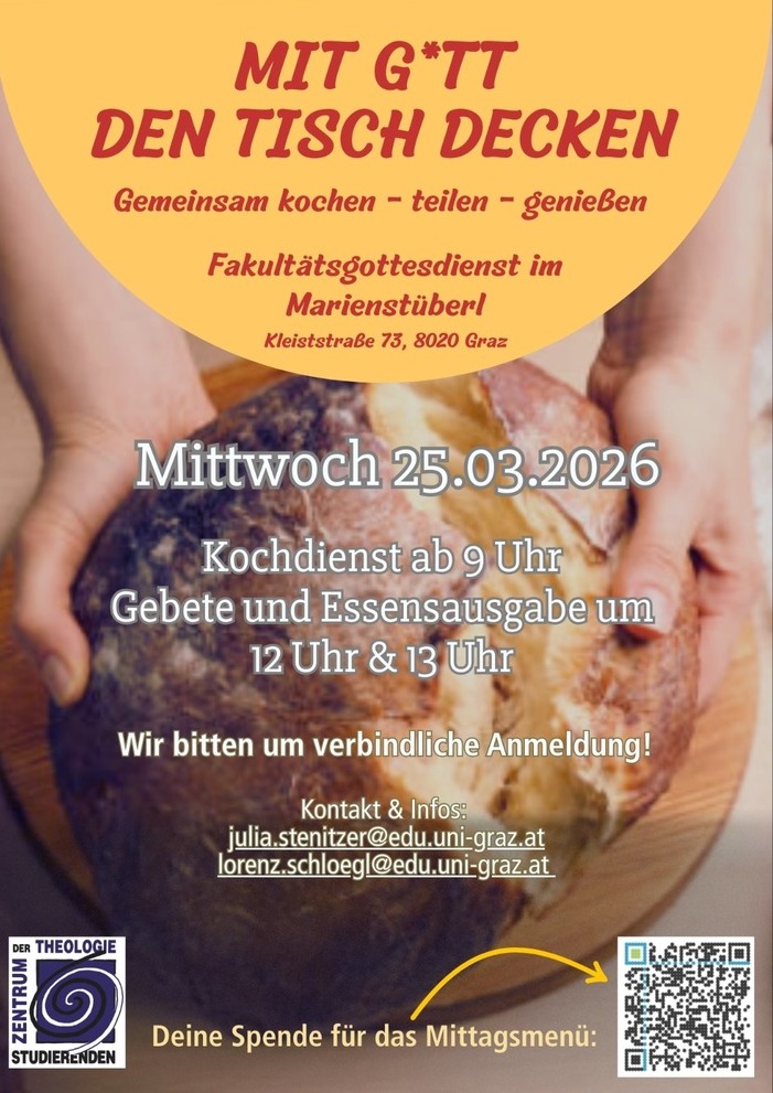 Mi 25. März, ab 9.00 | 12.00 und 13.00 Uhr (!) Fakultätsgottesdienst im Marienstüberl. Anmeldung erforderlich. Info s.u. und bei Julia Stenitzer und Lorenz Schlögl