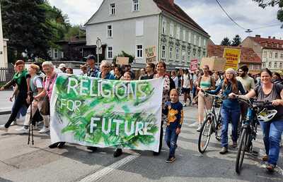 In Graz beteiligten sich Religions for Future beim Demonstrationszug, um gemeinsam mit anderen der Sorge um die zukünftigen Entwicklungen im Klima- und Umweltschutzbereich Ausdruck zu verleihen.