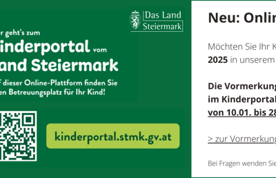 Die Vormerkung für das Kinderbildungs- und -betreuungsjahr 2025/ 2026 im Zeitraum von 10.01. bis 28.02.2025 über das Kinderportal des Land Steiermarks möglich.