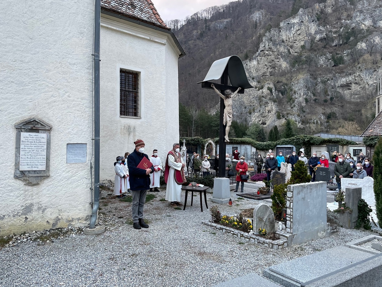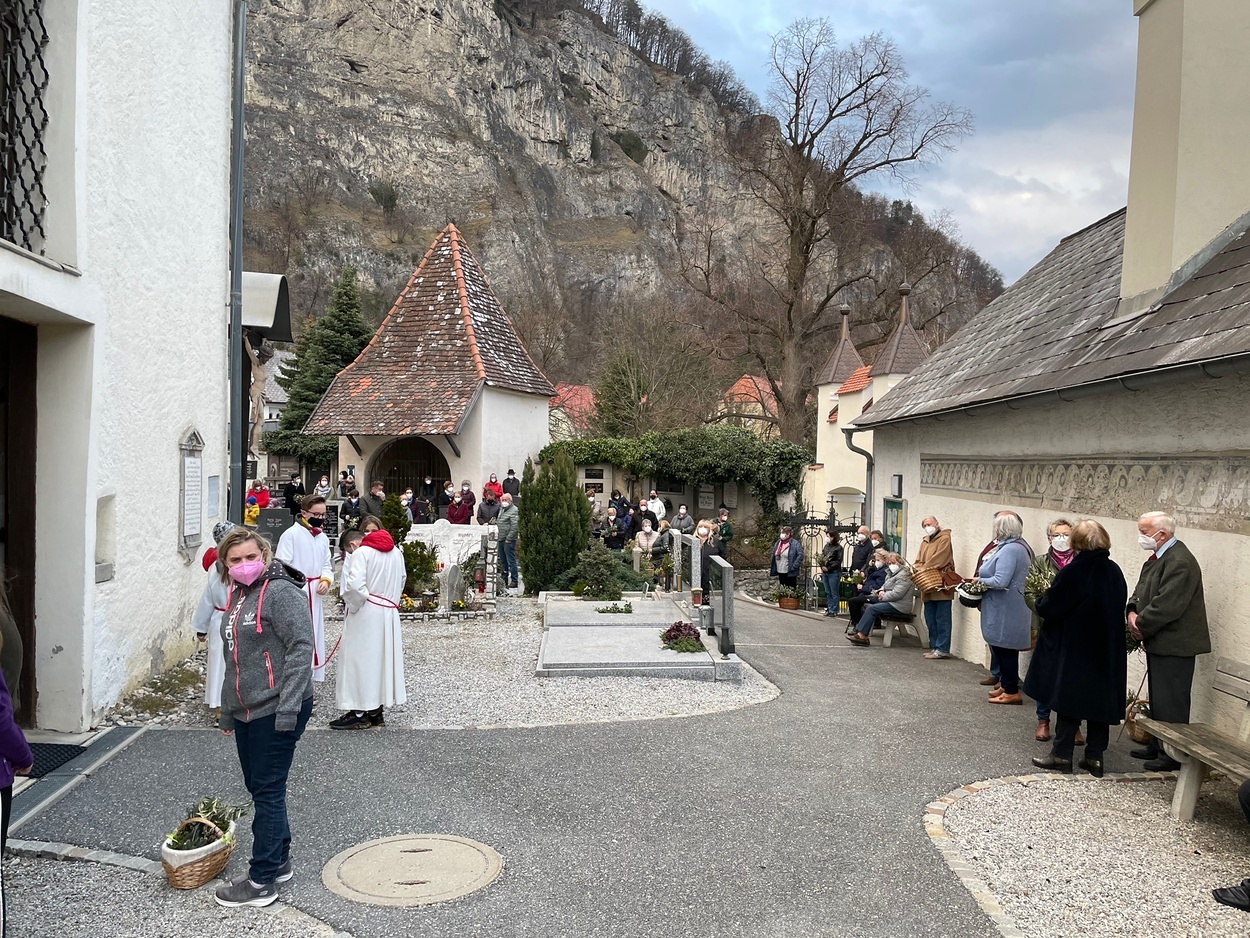 Am Vorabend des Palmsonntages 2021, um 18:00 Uhr, fanden sich auf beim Friedhofkreuz in Peggau, zahlreiche Menschen zur Segnung ihrer Palmzweige ein.