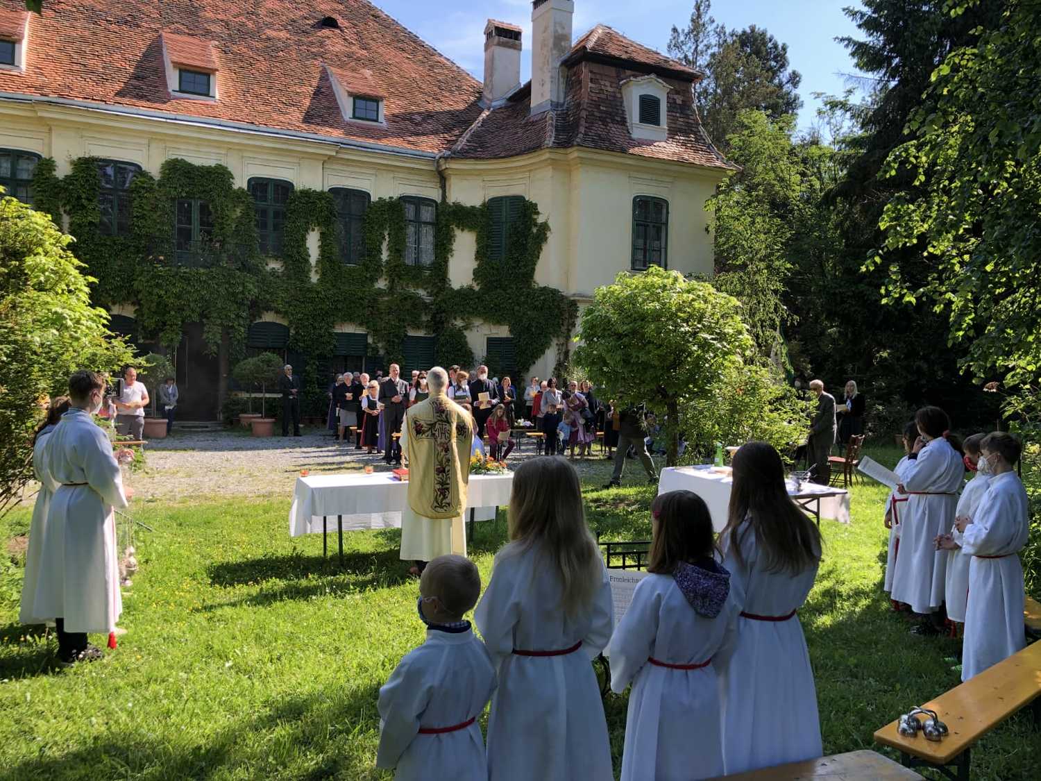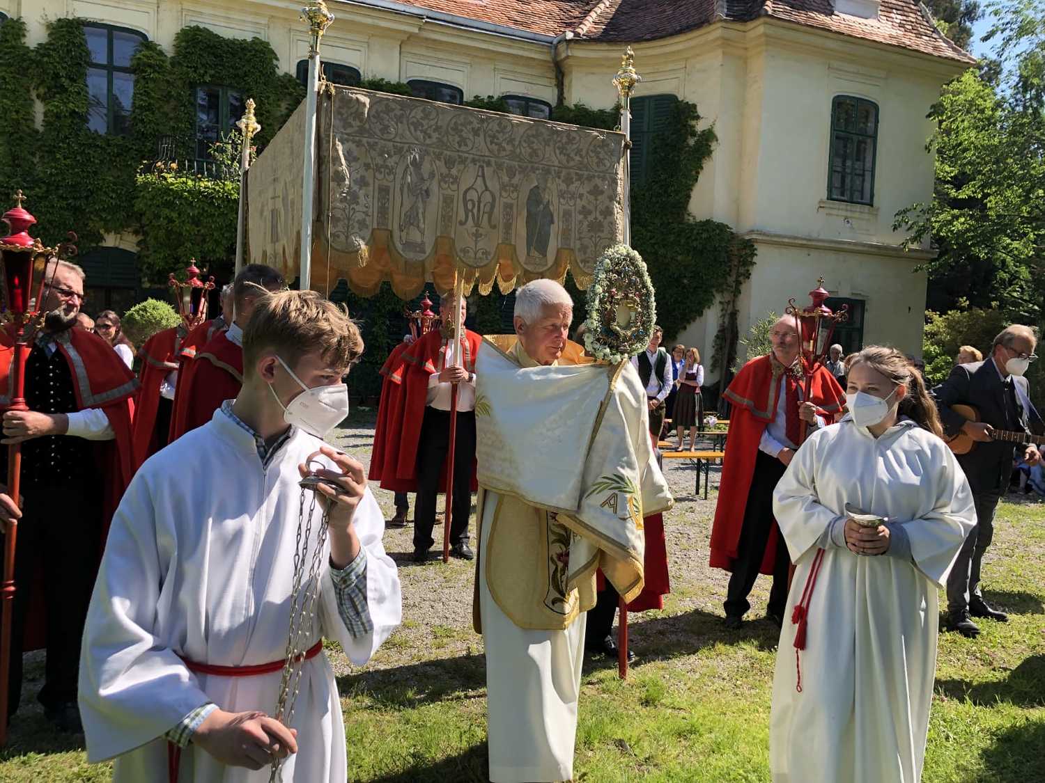 Die Natur zeigte sich von ihrer schönsten Seite, als wir im Hof des Schlosses Thinnfeld das Fronleichnamsfest feierten. Dabei wurden der restaurierte "Himmel" und die Laternen gesegnet.