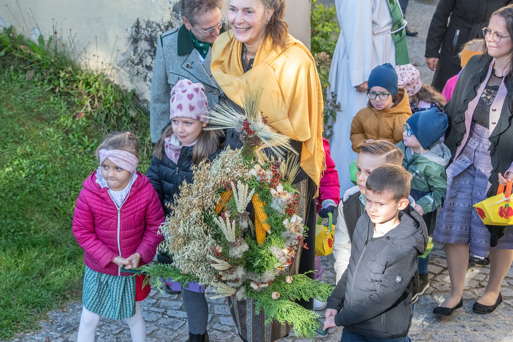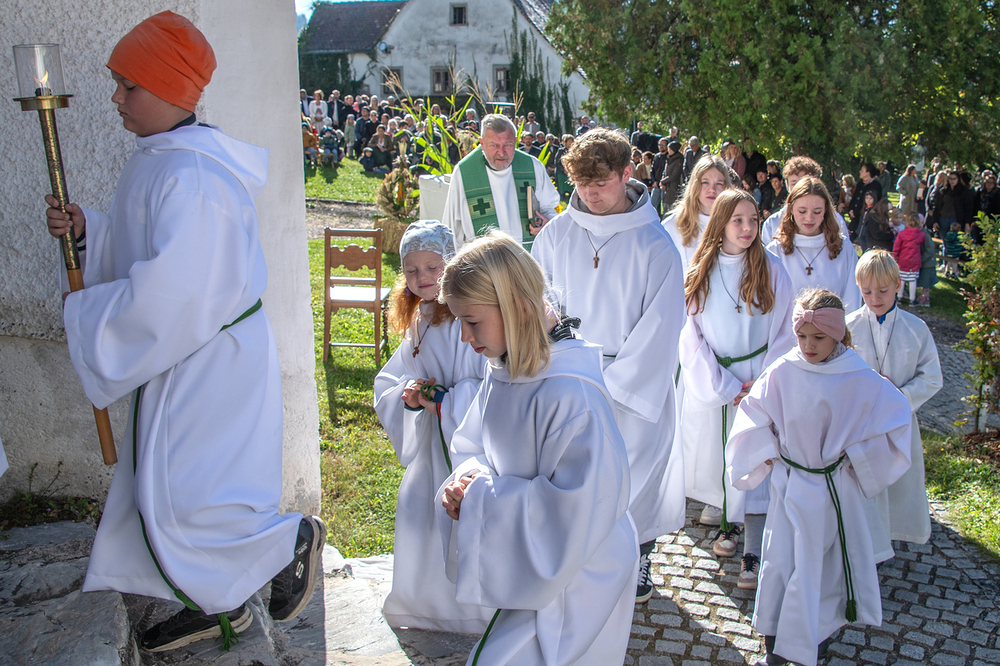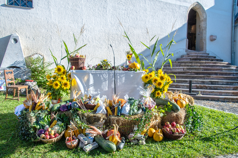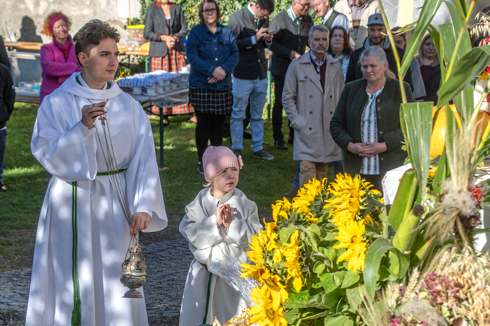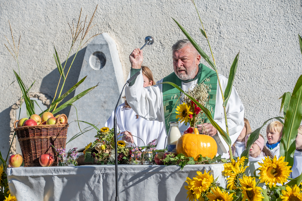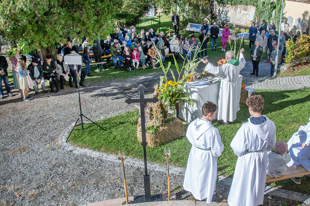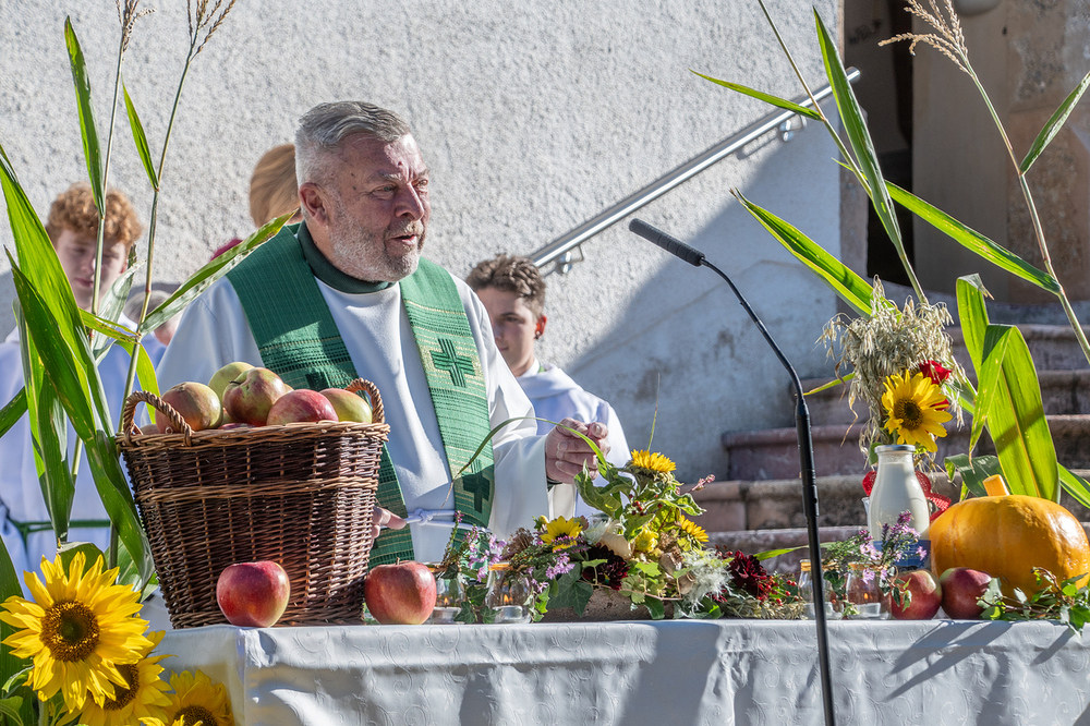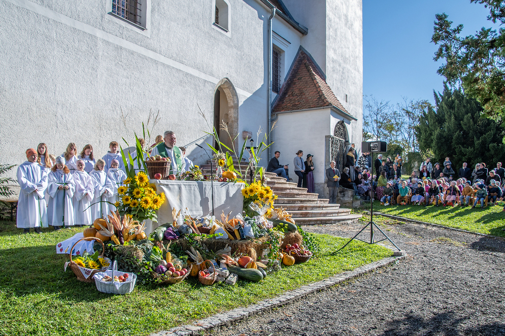 Das Erntedankfest konnte heuer dank schönem Wetter im Kirchhof gefeiert werden .