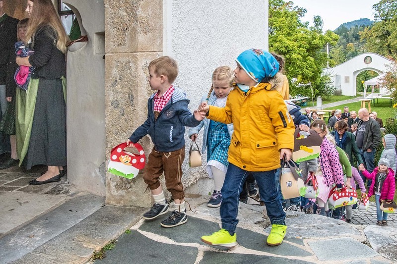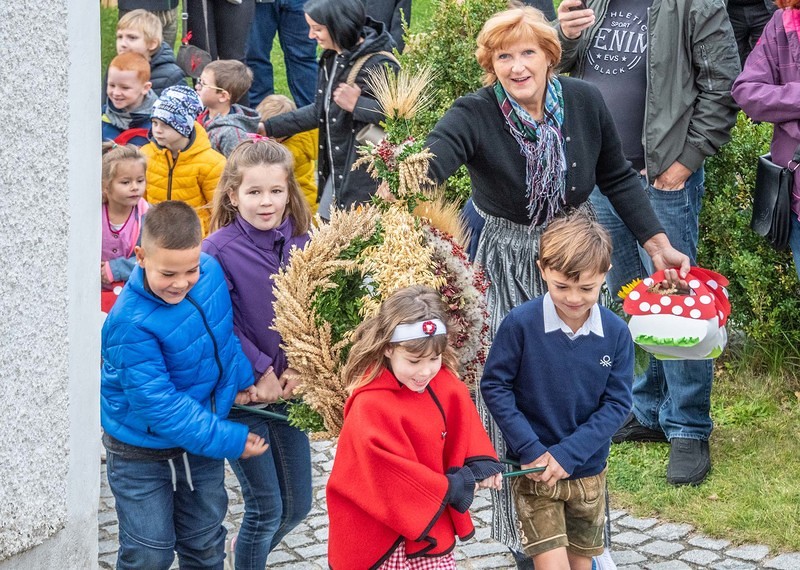 Die Kinder des Pfarrkindergartens zogen feierlich mit einer kleinen Erntekrone in die Kirche ein. Schon Wochen vorher übten sie verschiedene Lieder ein, die sie mit Begeisterung aus voller Kehle sangen. Vertreter der Bauernschaft legten Erntegaben vor dem Altar nieder und für die Bauern berichtete Frau Köppel von den Witterungsbedingungen des abgelaufenen landwirtschaftlichen Jahres, die eine gute Ernte ermöglichten. Sie wies aber auch auf die vielfachen anderen Bereiche unseres Lebens hin, für die wir dankbar sein müssen.