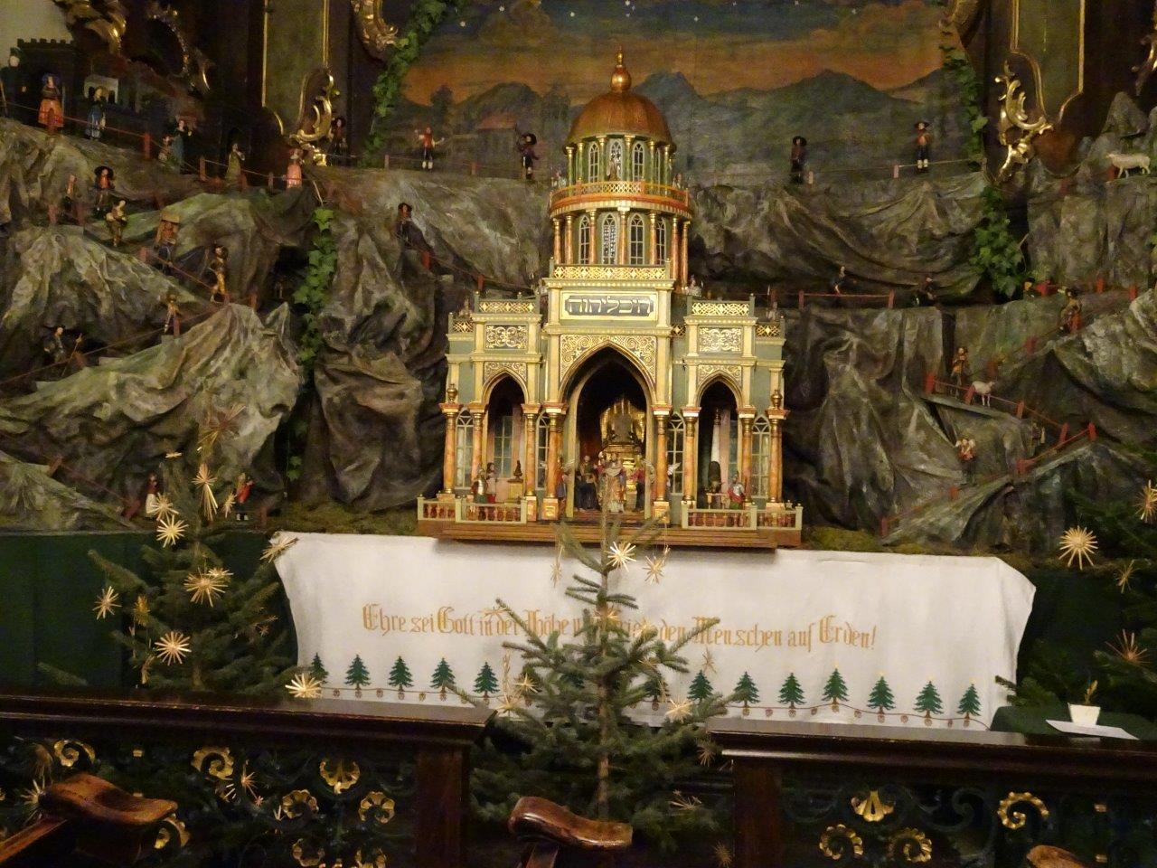 Fleißige Männerhände haben heute abends die Weihnachtskrippe in der Pfarrkirche umgebaut. An Stelle des Stalles wurde ein schöner Tempel aufgebaut.