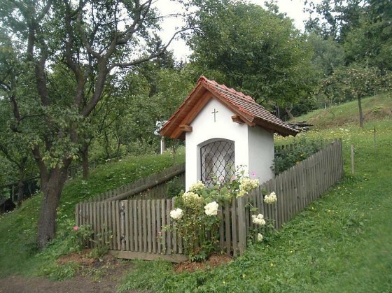 In 750 m Seehöhe liegt am Laufnitzberg der Bauernhof der Familie Karl Schneller jun. vulgo Egger – das Heimathaus der beiden fleißigen Pfarrmitarbeiterinnen Maria und Elisabeth Schneller, die dort geboren wurden und gemeinsam mit sieben weiteren Geschwistern ihre Jugendzeit verbrachten. Dieser Hof wurde bereits vor über 500 Jahren urkundlich erwähnt als „Dy Hofstatt auf dem Eckh“. Im Jahr 1929 übernahmen die Großeltern des heutigen Besitzers, Kreszentia und Karl Schneller, den „Eggerhof“ auf Leibrente. Als Kreszentia Schneller im Jahr 1994 von einer schweren Krankheit genas, beschlossen die Hoferben, Johanna und Karl Schneller sen., als Zeichen der Dankbarkeit neben ihrem gepflegten Wohnhaus im Obstgarten einen Bildstock zu errichten, an dessen Anblick sich Mutter Kreszentia noch drei Jahre erfreuen durfte. Auch der unerklärliche Umsturz eines Kreuzes hinter dem Haus, bei dem früher die Kreuzwegandacht am Laufnitzberg begonnen hatte, wurde als Wink von „oben“ zum Bau eines neuen Glaubenszeichens gedeutet.