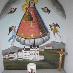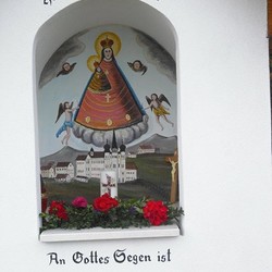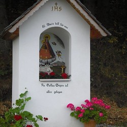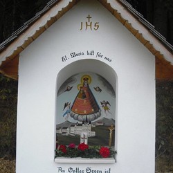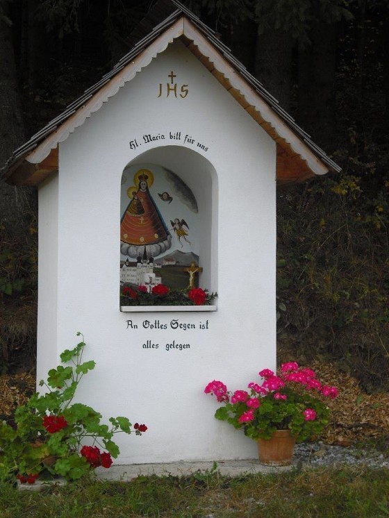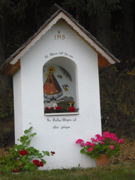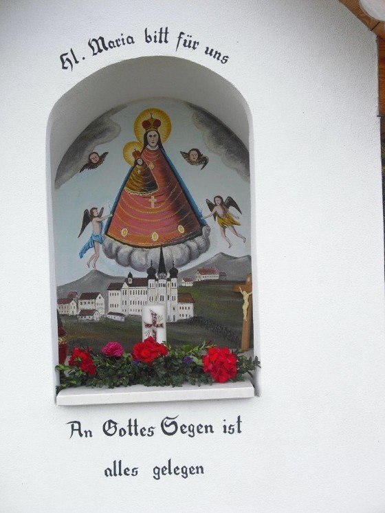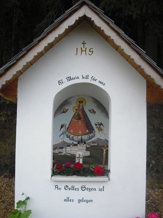 Das Andachtsbild zeigt die gekrönte Mariazeller Madonna mit dem ebenfalls gekrönten Jesuskind auf ihrem rechten Arm, künstlerisch gestaltet vom bekannten Maler Franz Kainz vlg. Tranninger aus der Gams. Als Vorlage verwendete er ein Bild, das der ehemalige Landeskonservator und Nachbar Hofrat DI Dr. Friedrich Bouvier beisteuerte. Die feierliche Einweihung erfolgte am 21. Oktober 2012, demAdriacher Kirchweihfestsonntag, durch den Übelbacher Pfarrer Dr. Horst Hüttl unter großer Anteilnahme von Familie, Verwandten, Nachbarn und Bekannten sowie mit festlicher Hausmusik.