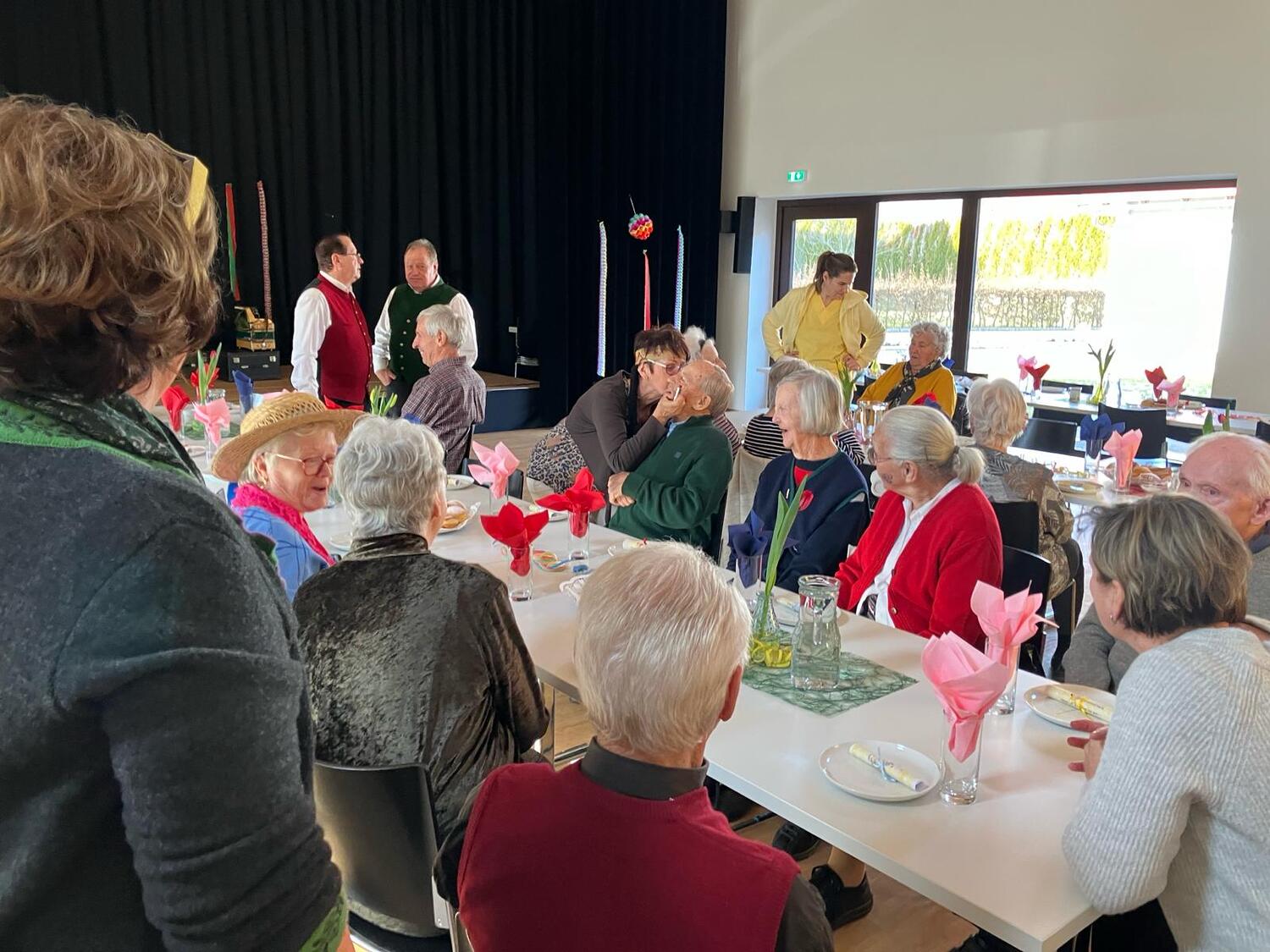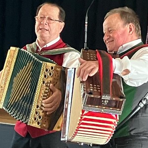 Der Höhepunkt des Nachmittags waren Mori Hans und Tschernko Karl. Die zwei Musikanten unterhielten die Feiernden mit ihrer Musik und Witz­ein­la­gen köstlich. Bei Krapfen, Strauben, Kaffee und Wein wurde viel geplaudert, gesungen und gelacht.
