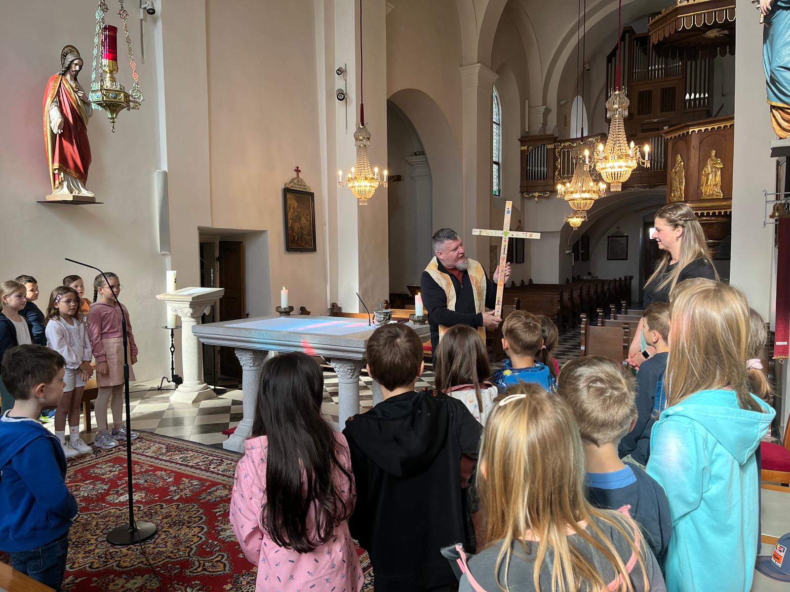 Die Kinder haben das Holzkreuz mit religiösen Symbolen verziert und nun wurde es von Herrn Pfarrer Schneeflock im Beisein von den Lehrerinnen Monika Riegelnegg, Birgit Fauth und den Kindern der beiden ersten Klassen feierlich gesegnet.