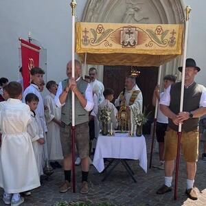 Ein gro­ßes Dan­ke­schön gilt allen, die mit der auf­wän­di­gen Vor­be­rei­tung der Blü­ten­tep­pi­che und den Diens­ten rund um das Fest das Brauch­tum um die Pro­zes­sion be­wah­ren.