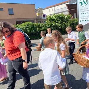Danke auch allen Eltern für den wun­der­schö­nen Blu­men­tep­pich vor der Kir­che und die Be­glei­tung der Kin­der zu die­sem Hoch­fest.