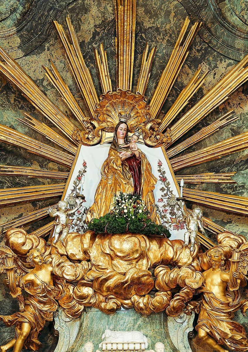Der Hochaltar wurde von Lukas von Schramm geplant und bildet mit seinen mächtigen Marmorsäulen und dem großartigen Aufbau einen prächtigen Rahmen zur Altarmitte mit der Gnadenstatue.