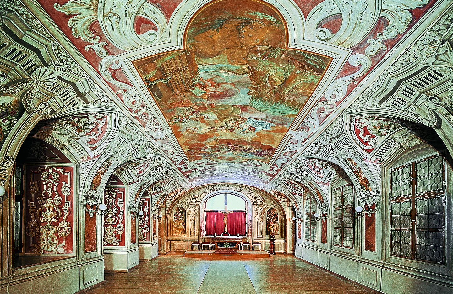 Wir treten durch das schöne Portal in die Kirche ein. Der Raum ist groß und eindrucksvoll. Die ganze Schönheit ist auf den Hochaltar verwendet und auch die Fresken geben der Kirche ihren prunkvollen Ausdruck.