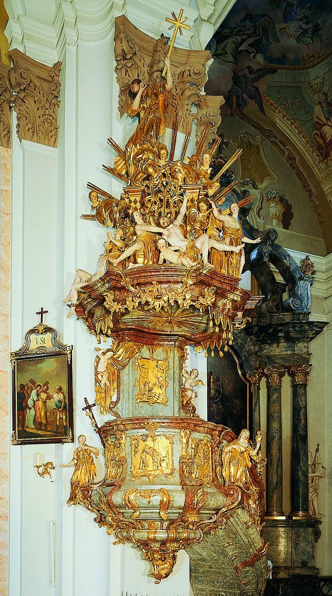 Die Kanzel, um 1770, wird Veit Königer zugeschrieben. Sie zeigt einen wunderbaren Reichtum an Figuren und vergoldeten Relieftafeln welche wunderbare Ereignisse des Wallfahrtsortes und Stationen aus dem Leben Mariens darstellen. Auch die drei göttlichen Tugenden sind großfigurig dargestellt: der Glaube am Kanzeldach (Kreuz), die Hoffnung (Anker) und die Liebe (Herz) am Kanzelkorb. In der Darstellung des Kanzeldaches soll der Name Mariens aufstrahlen. Sie ist die Helferin der Kranken, Betenden, Besessenen.
