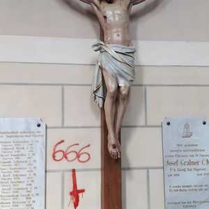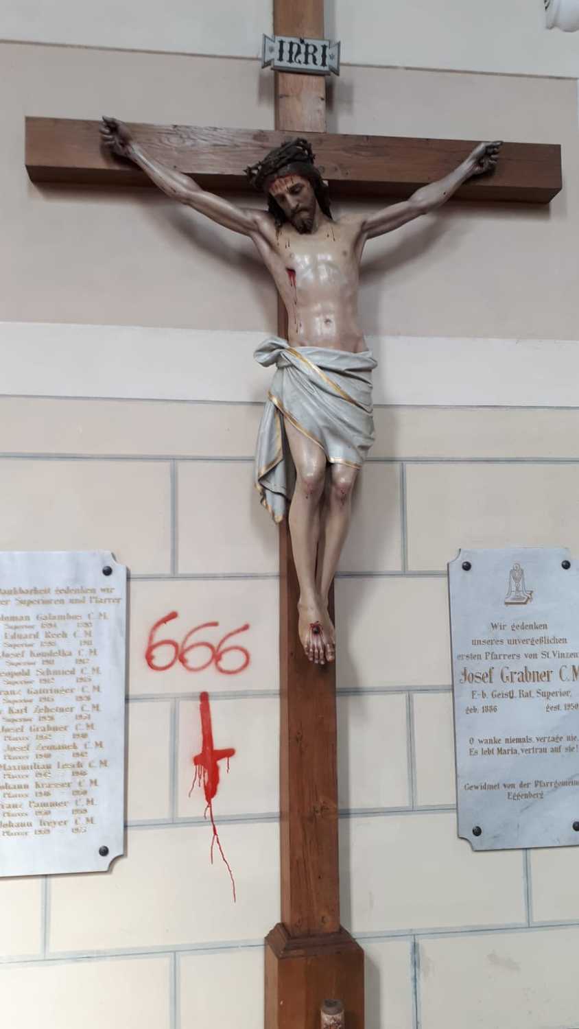 Mit satanistischen Symbolen wurde unser Kircheninnenraum verunstaltet. "Es ist eine entsetzliche Missachtung eines Kirchenraumes, mehr noch, ein Zeichen von Christentum- und Kirchenhass", so Pfarrer Wolfgang Pucher.