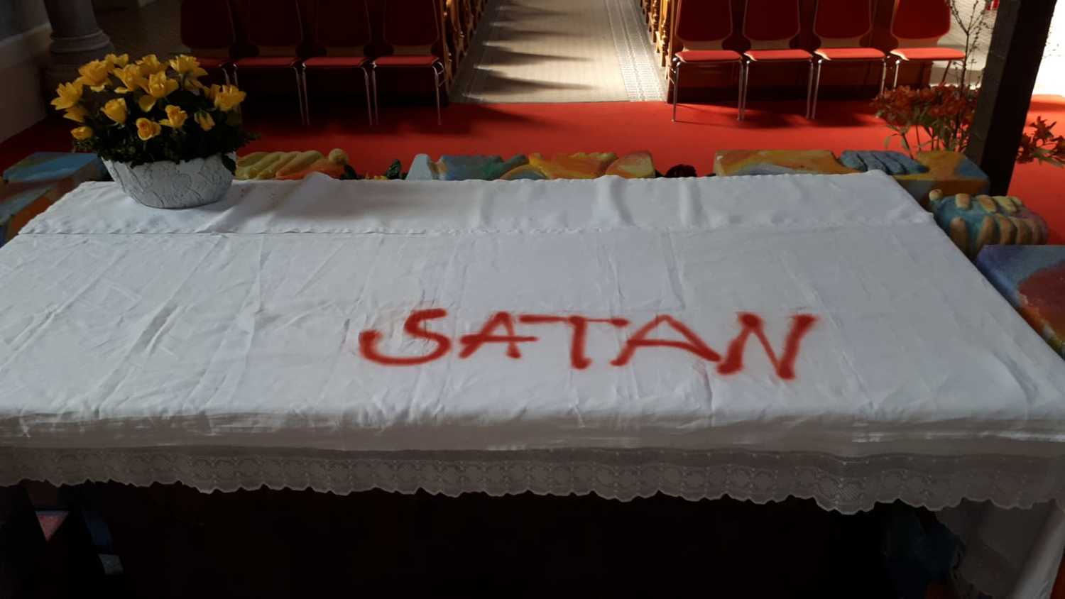 Am Donnerstag (28.04.) hat jemand in unserer Kirche an verschiedenen Orten, unter anderem auch auf dem Altar, hässliche Worte und Zeichen angebracht. Es sind dies Hinweise auf Satanismus.