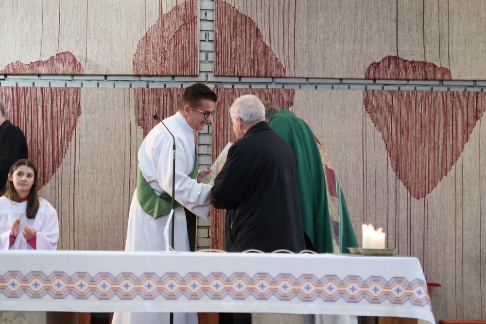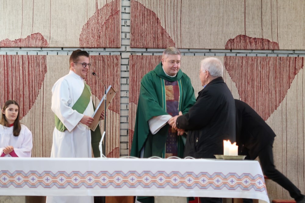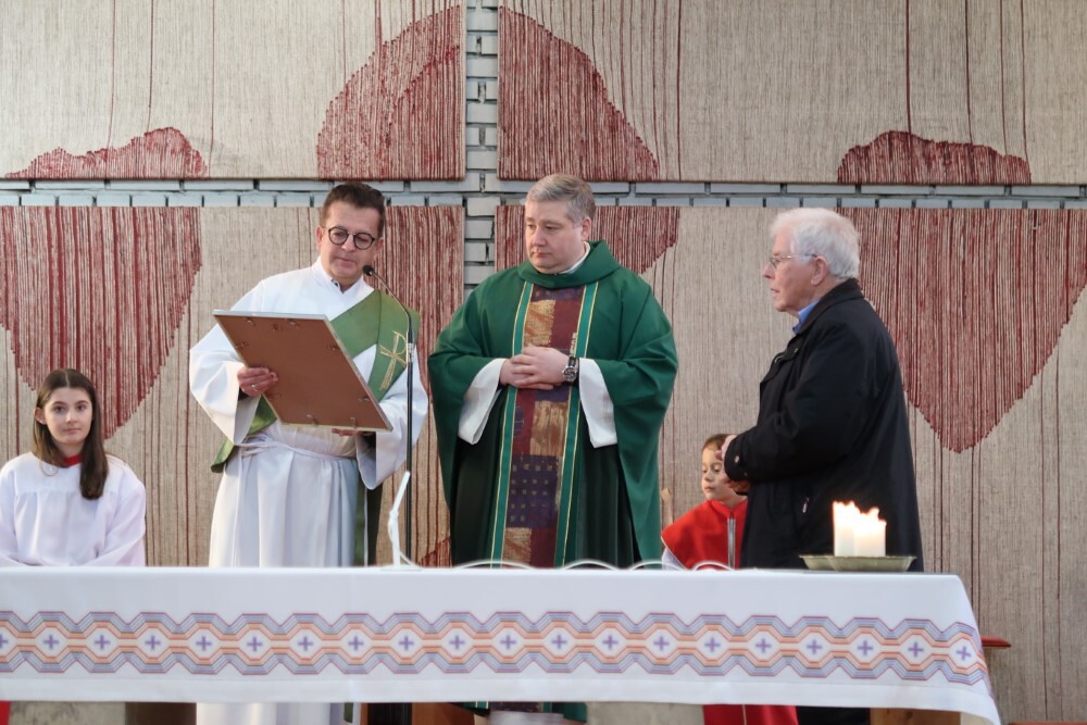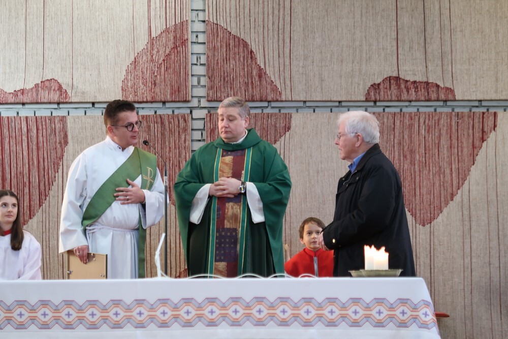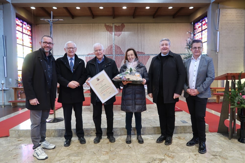 Pfarrer Claudiu Budau und Wolfgang Garber vom Führungsteam gratulierten Gerhard mit einer bischöflichen Urkunde zu seinem 80. Geburtstag sowie fast 50 jährigem Ehrenamt in der Pfarre Lieboch.