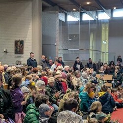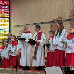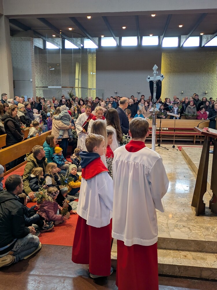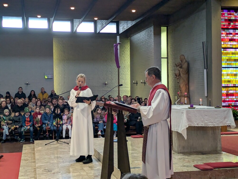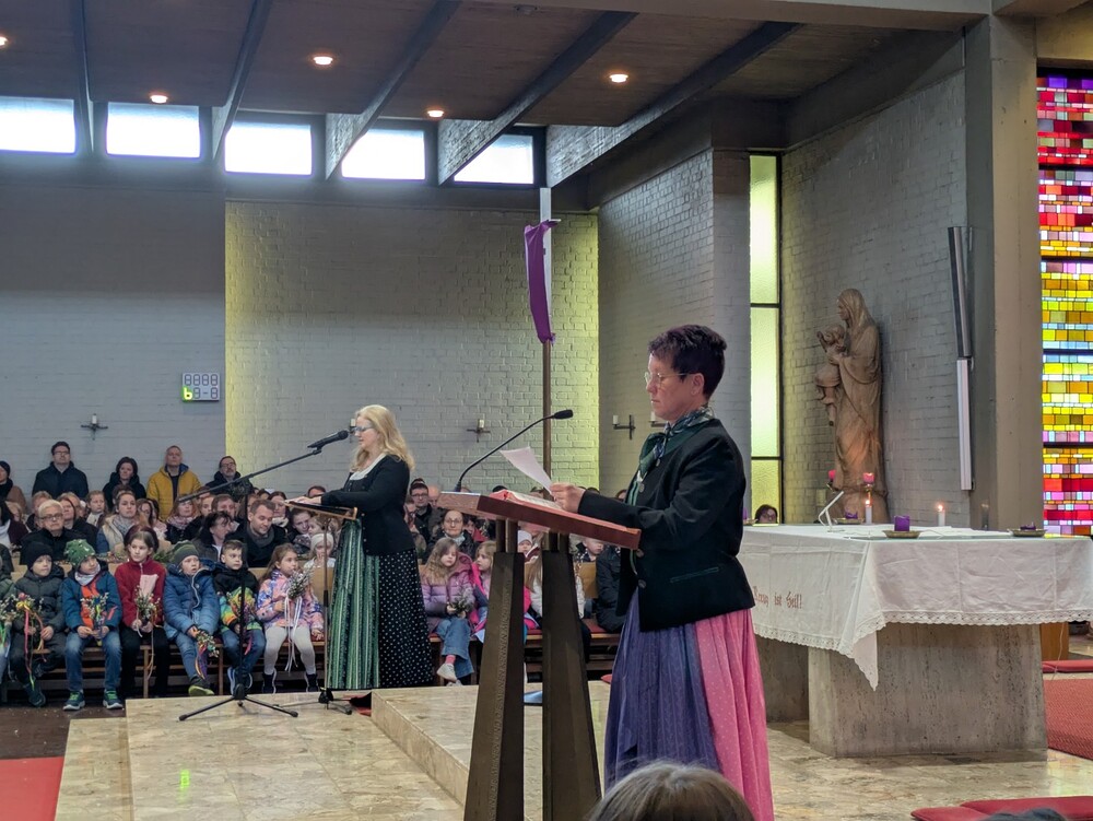 Wir zogen mit den Kindern, die ein Spalier bildeten und Jesus mit den Palmbuschen zugewunken und gesungen haben, ein. Diakon Franz Habith und Pastoralreferentin Ines Kvar interviewten einige „Jerusalemer Bürger_innen“ zu ihrer Meinung zu diesem Jesus von Nazareth. Das war eine spannende neue Form anstatt der Predigt und ging der Frage nach, wer dieser Jesus ist.