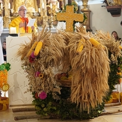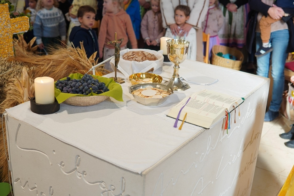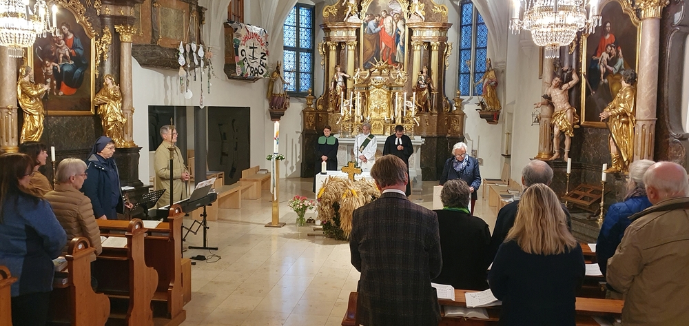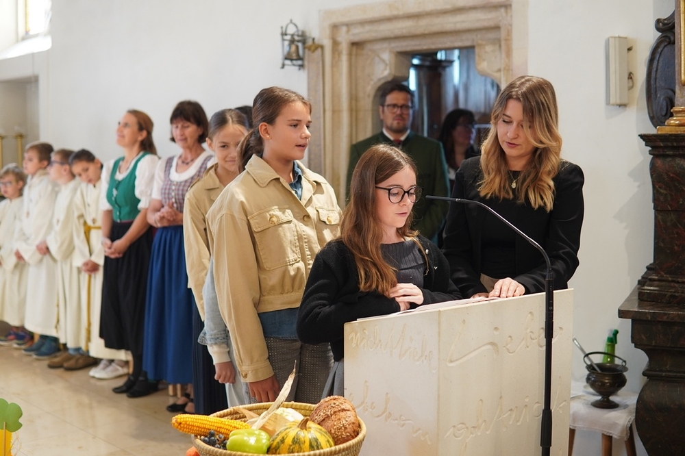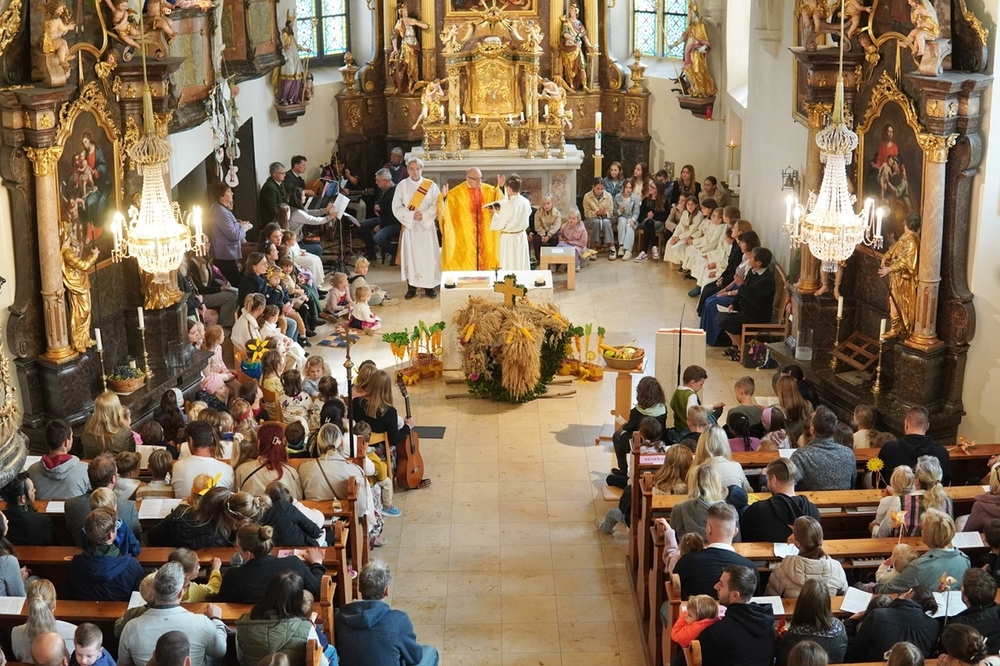 Nach dem feierlichen Einzug fand die Erntedankkrone, dieses liebevoll geschmückte Symbol reicher Ernte, vor dem Altar ihren Ehrenplatz. Danke der Landjugend Zettling für diese schöne Tradition!