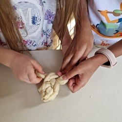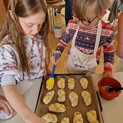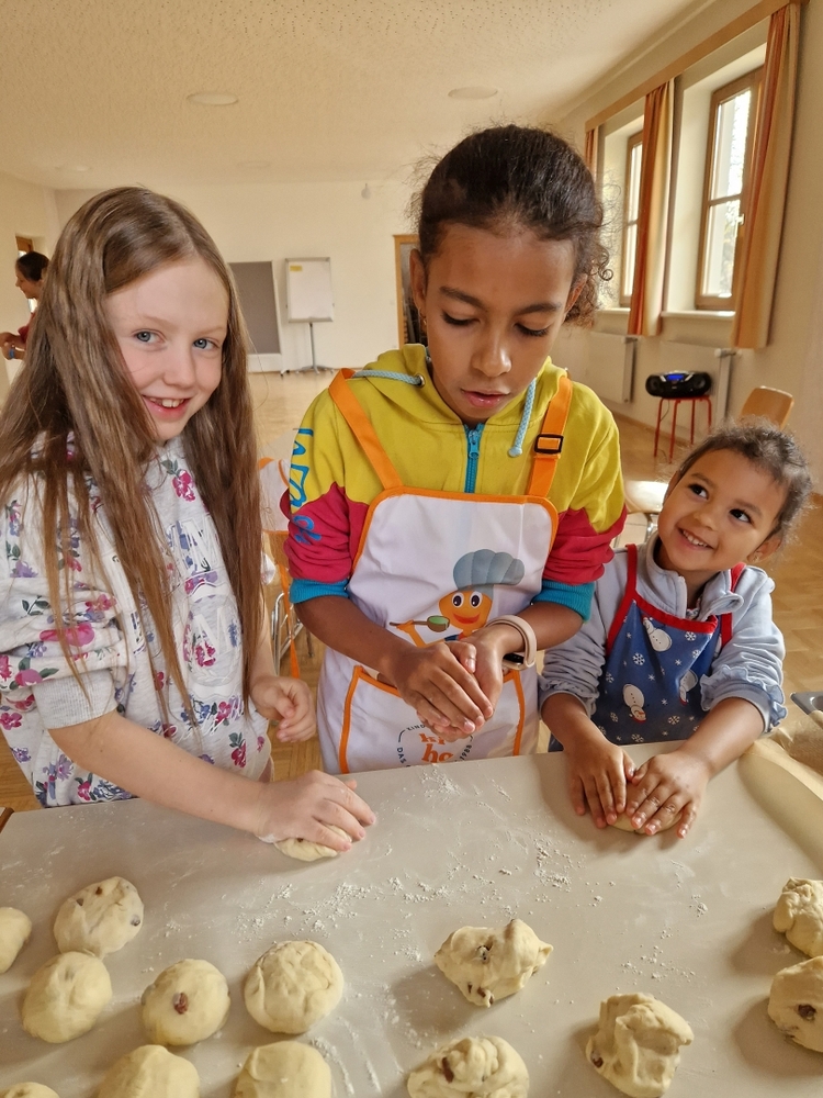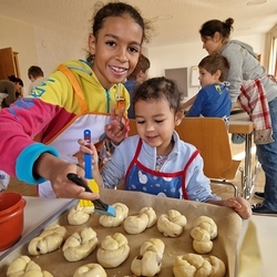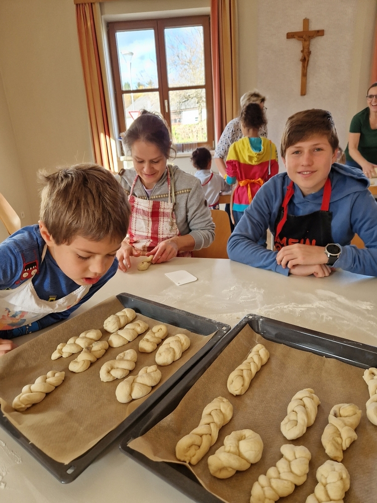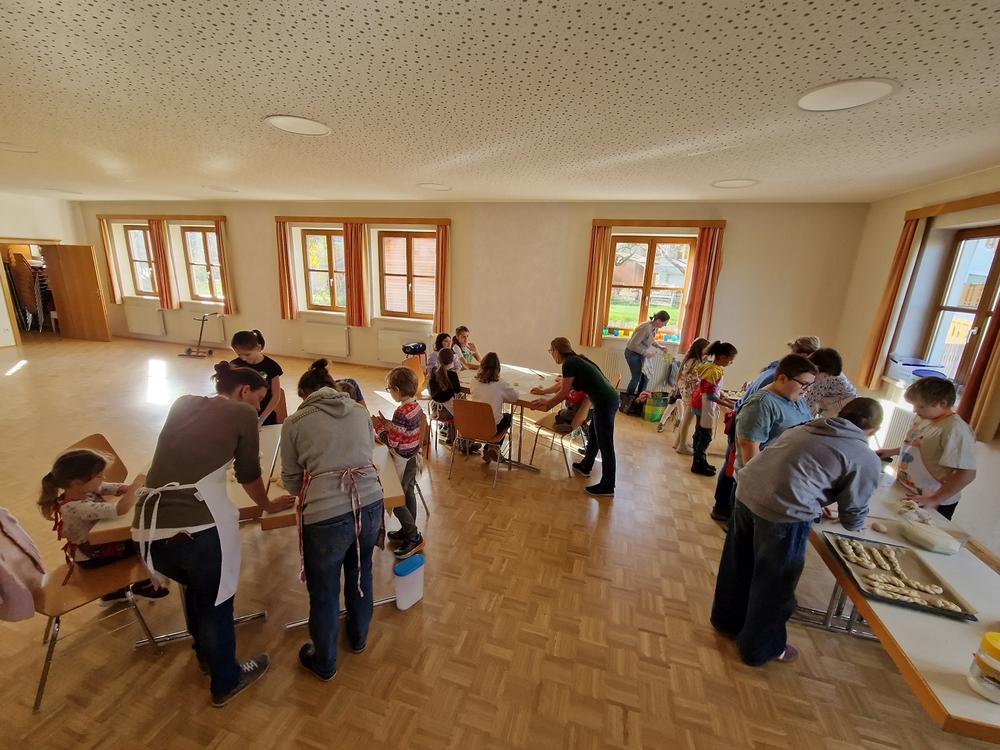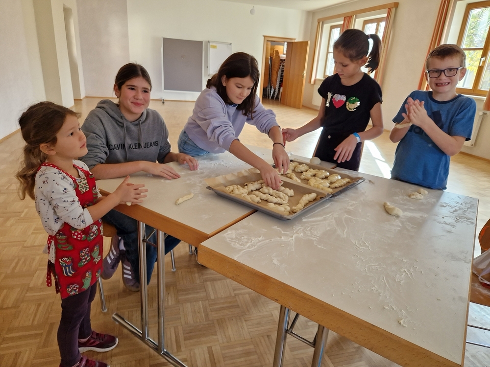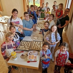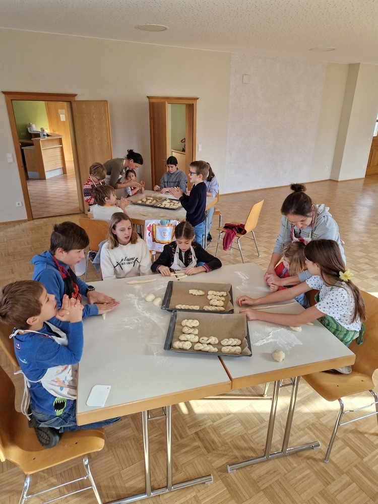 Am 31. Oktober fanden sich auch heuer wieder viele große und kleine Bäckerinnen und Bäcker im Pfarrheim ein, um aus 12 kg Germteig herrliche Allerheiligenstriezerl zu formen. Sieben Erwachsene sowie alle Minis und eventuell zukünftige Minis (insgesamt 16 Kinder) waren von 9 -11 Uhr mit Feuereifer dabei.