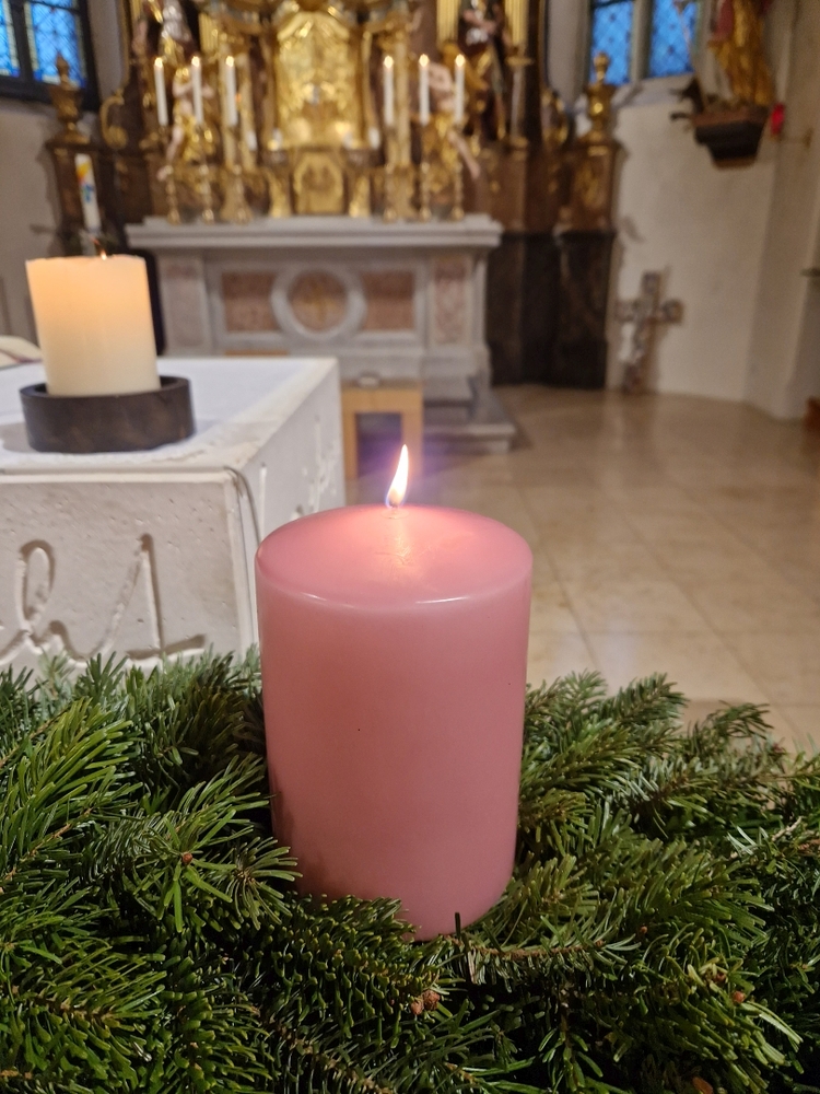 Die Vorfreude steht im Mittelpunkt des Gaudete-Sonntags! Daher erstrahlt als dritte Kerze die rosafarbene, die den hellen Charakter dieses Sonntags betont.