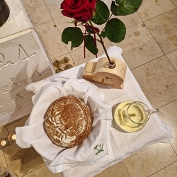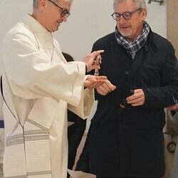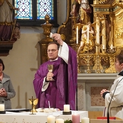 Vor dem Schlusssegen überreichte Ernst Pock im Namen der Pfarre dem neuen Diakon ein Aspergill, mit dem dieser gleich voll Freude die Gläubigen segnete. Für seine Ehefrau Eva, die ihm begleitend zur Seite steht, gab es einen Blumenstrauß, mit den besten Wünschen für sie.