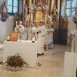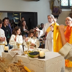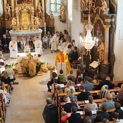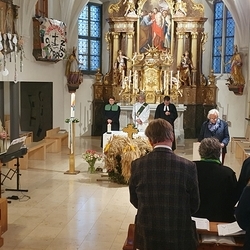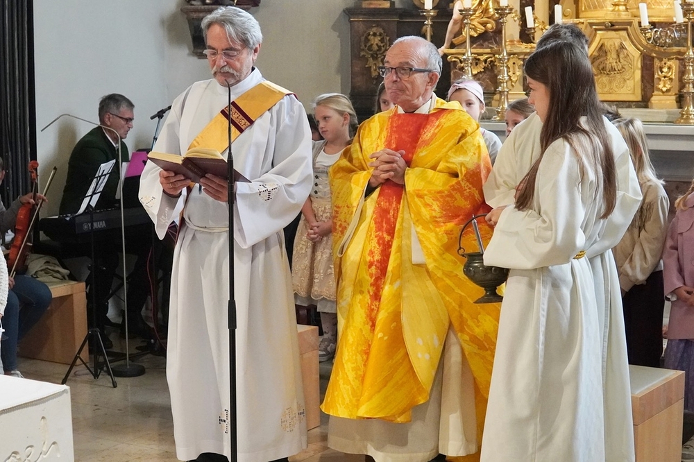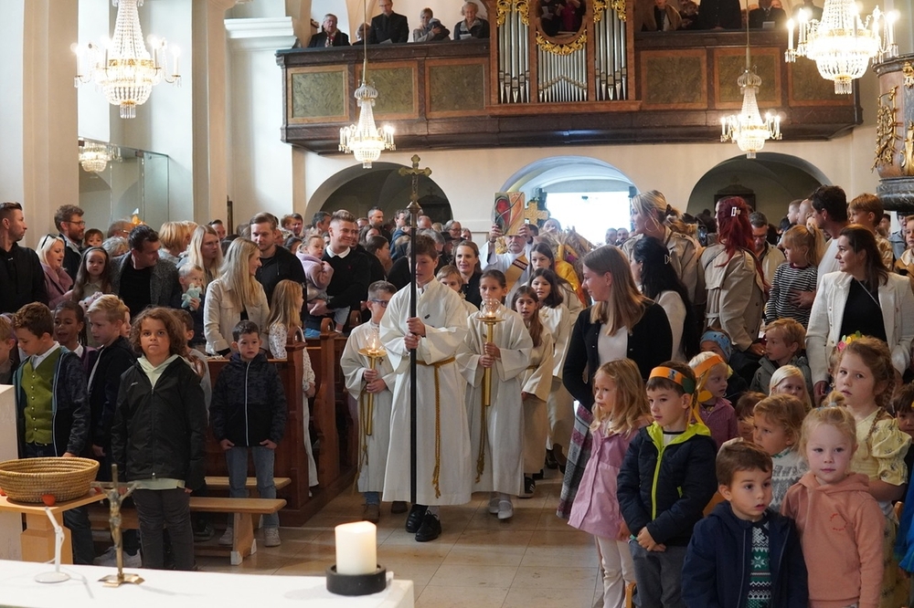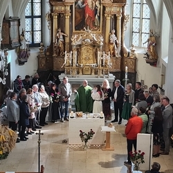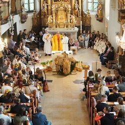 Voll Dankbarkeit und Freude feierten wir das diesjährige Erntedankfest in unserer mit großen und kleinen Leuten gut gefüllten Kirche. Vikar Norbert Glaser zelebrierte die heilige Messe, assistiert von Diakon Michi Zepf und sieben tüchtigen Minis.