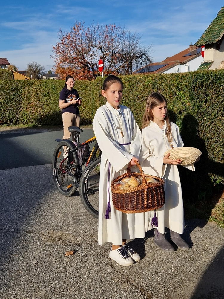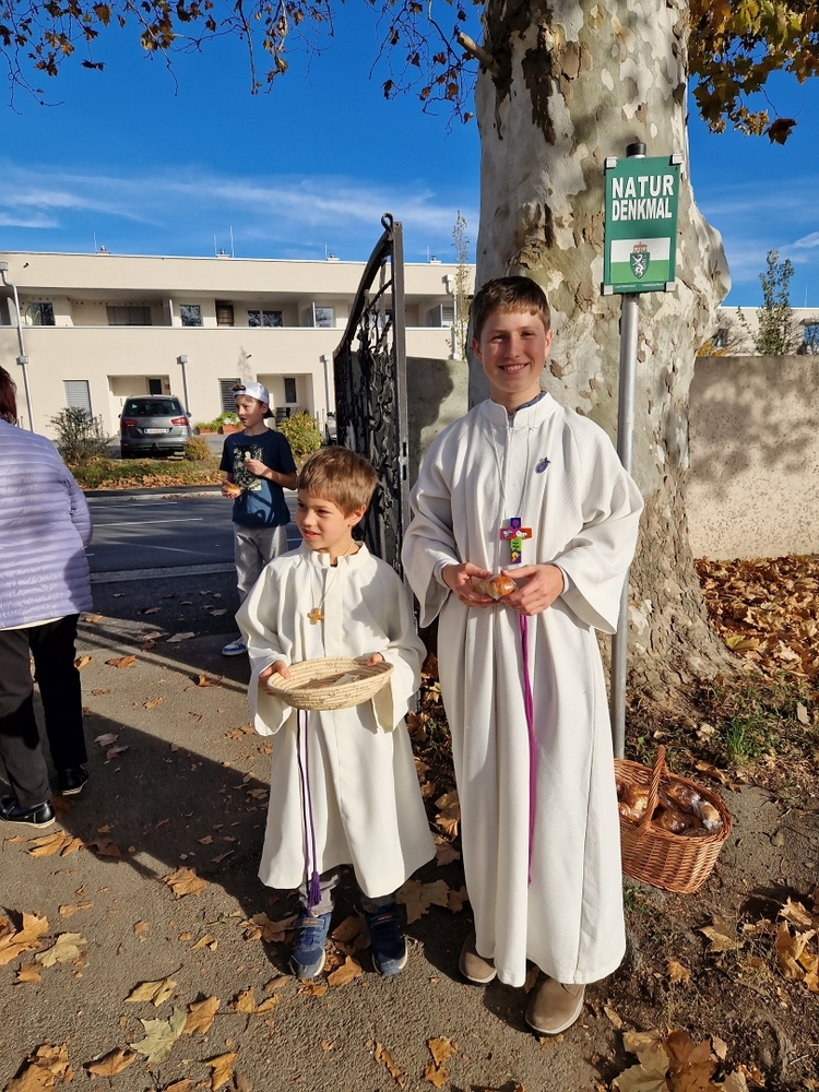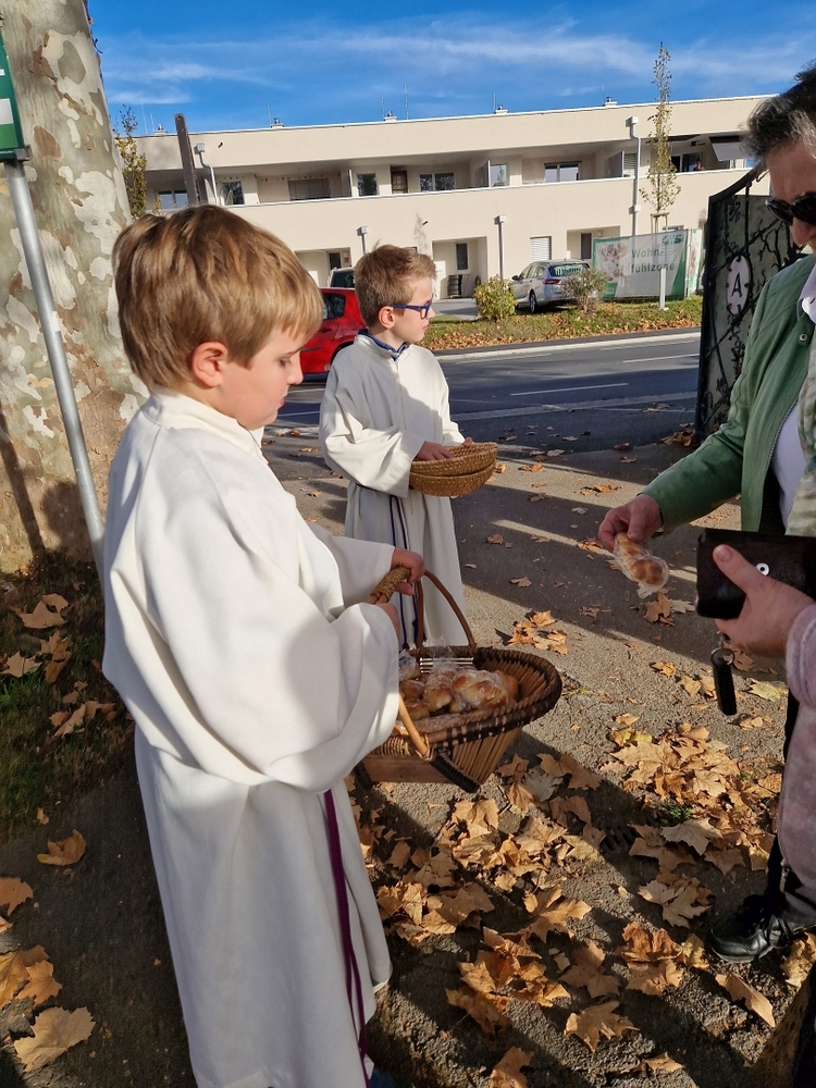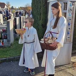 Zum Abschluss boten die bei der Feier fleißig assistierenden Minis an den Friedhof-Ausgängen gegen freiwillige Spende ihre am Vortag gebackenen Allerheiligenstriezerl an, die im Nu ausverkauft waren!