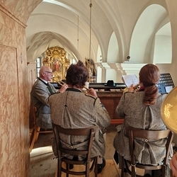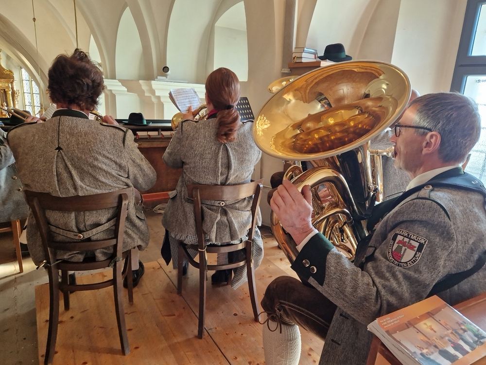 Musikalisch gestaltete eine Abordnung der MUZ von der Empore aus die heilige Messe - und auch danach beim Totengedenken mit Kranzniederlegung vor dem Kriegerdenkmal waren die Musiker*innen zur Stelle.