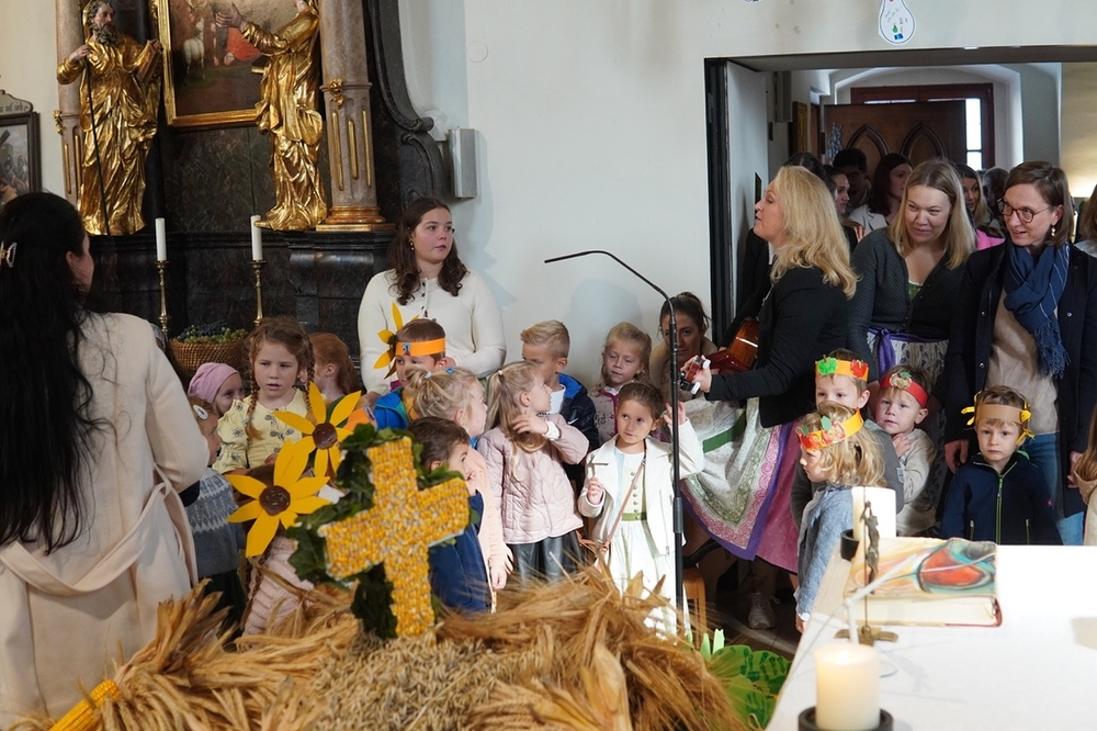 Mit dem „Erntedank-Tanz“ brachten die Kindergarten- und Kinderkrippenkinder buntes Leben in die Feier, auch das „Vater unser“ sowie das „Farbenlied“ lockten sie und alle anderen Kinder aus der Reserve.