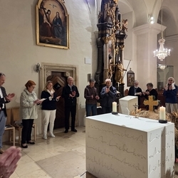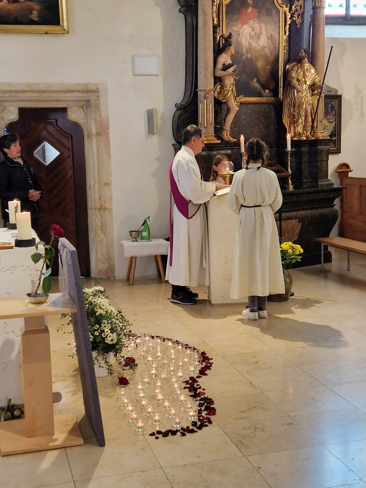Vor dem Altar brannten 59 Teelichter für alle Menschen, die im letzten Jahr in unserer Pfarre verstorben sind. Ihre Namen wurden noch einmal laut ausgesprochen. Ein Teelicht leuchtete für alle Verstorbenen, die ungenannt blieben.