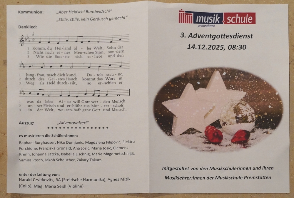 Die musikalische Gestaltung lag wieder in den Händen der Musikerinnen und Musiker der Musikschule Premstätten. Orgelmusik und Holzbläserensembles erfüllten die Kirche mit adventlichen Klängen und erfreuten alle Mitfeiernden.