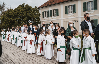 12 Buben und Mädchen der 1. und 2. Stufe der VS Weinburg haben am Samstag, dem 8. Mai 2021 in der Pfarrkirche St. Veit am Vogau zum ersten Mal die hl. Kommunion empfangen. Jesus Christus verbindet Himmel und Erde, stärkt mit „seinem Leib“ die Gläubigen und schafft Gemeinschaft mit Gott und untereinander.