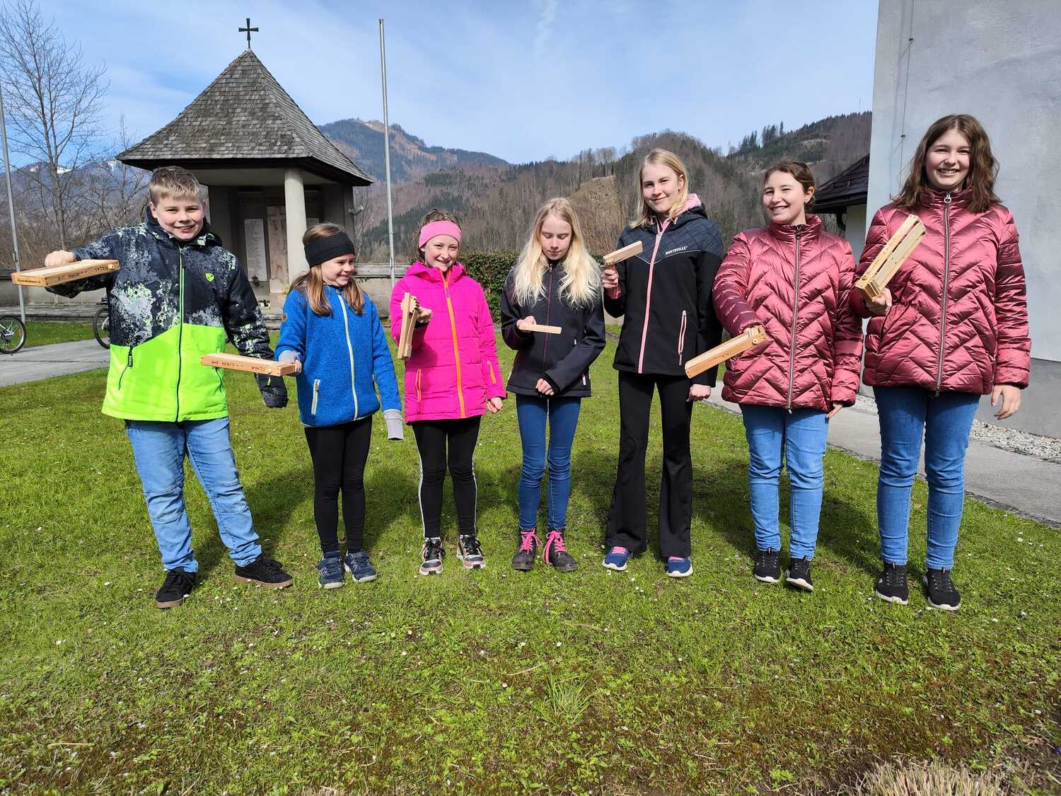 Die Kreuzwegbilder der Volkschulkinder und das Leidenkreuz der Jungschar Altenmarkt wurden an Ostern durch Auferstehungsbilder (der Frühling lässt grüßen) und durch ein helles Heilskreuz ersetzt.